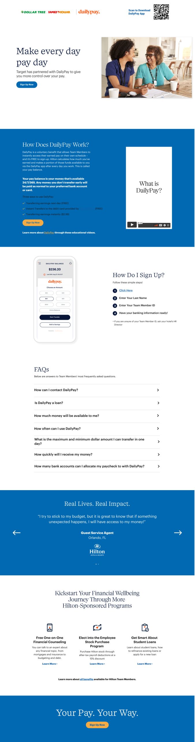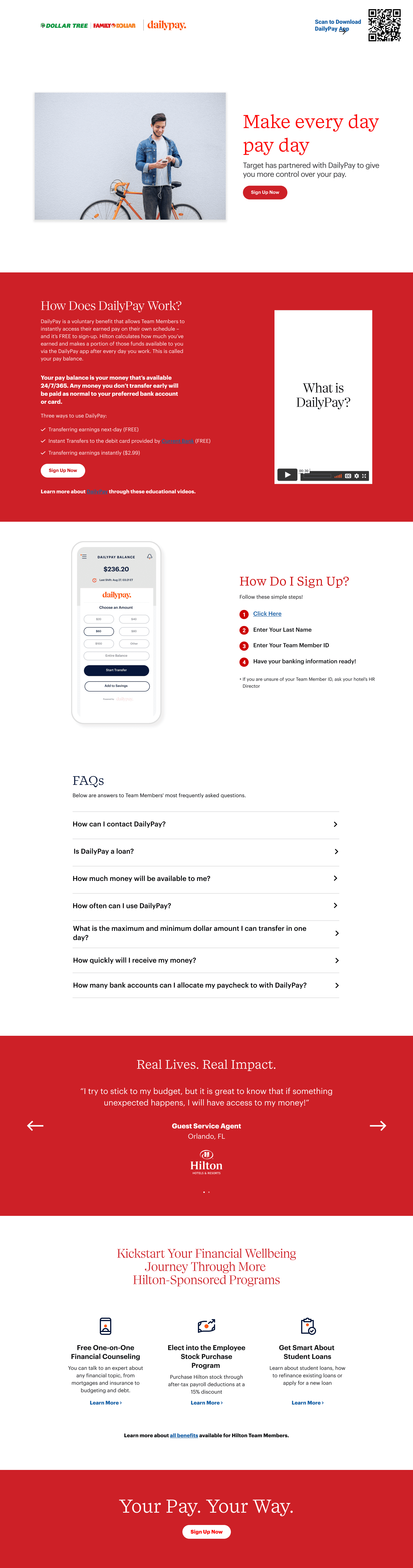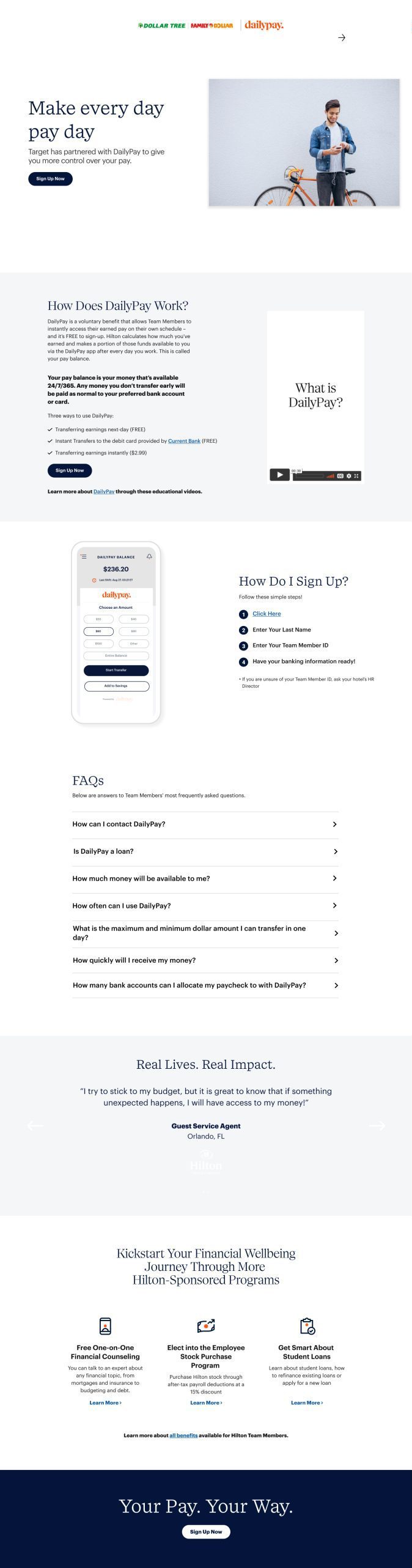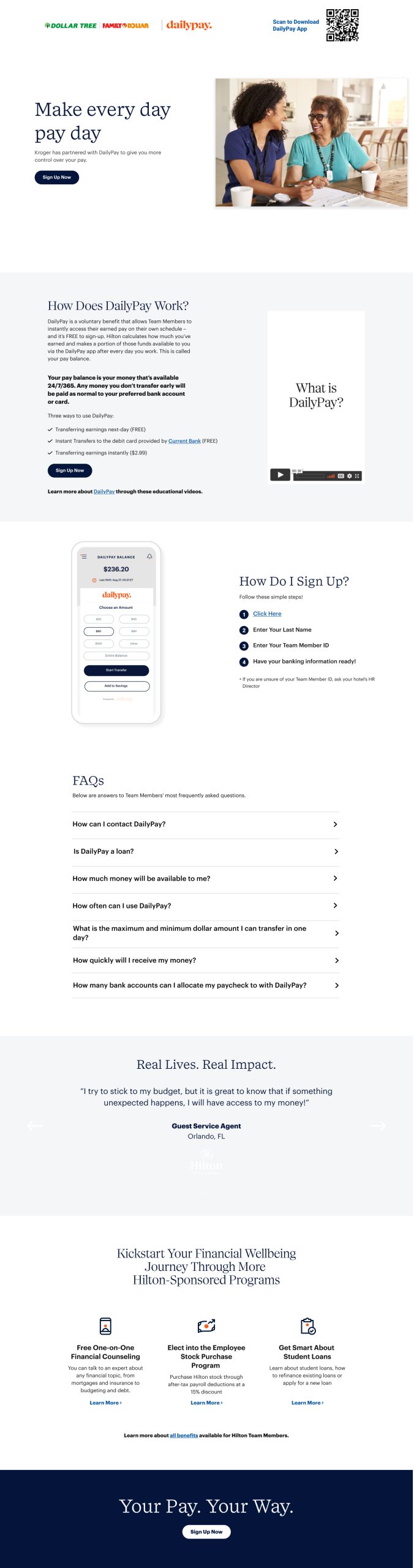 In collaboration with Daily Pay, a leading provider of on-demand pay solutions, I had the opportunity to enhance several front-end UI pages. Daily Pay offers a platform that enables employees to access their earned wages before their scheduled payday, providing financial flexibility and empowerment. My focus was on redeveloping partner landing pages for renowned brands such as Target, Kroger, Dollar Tree, and DaVita.