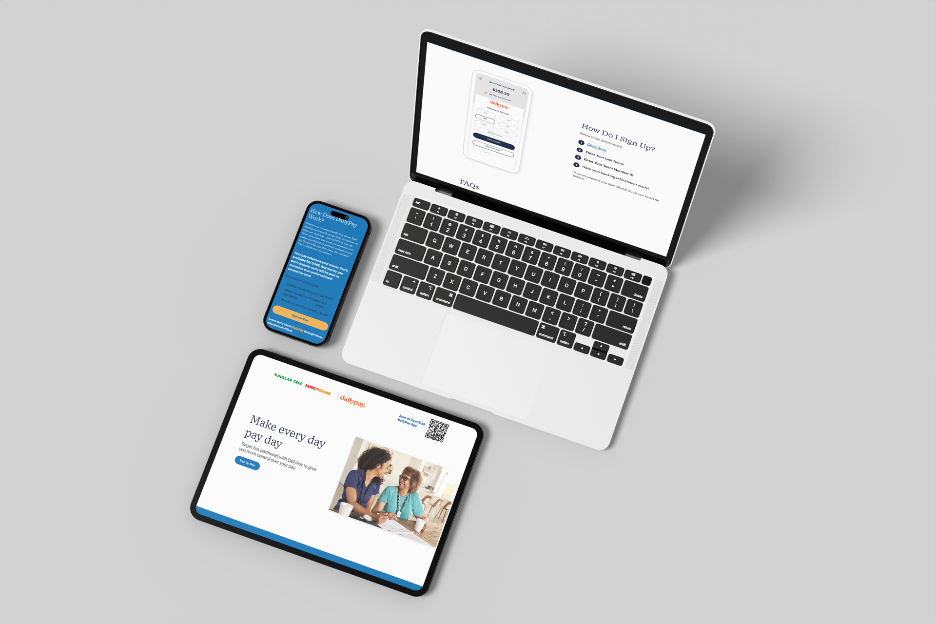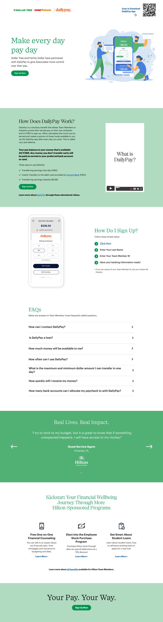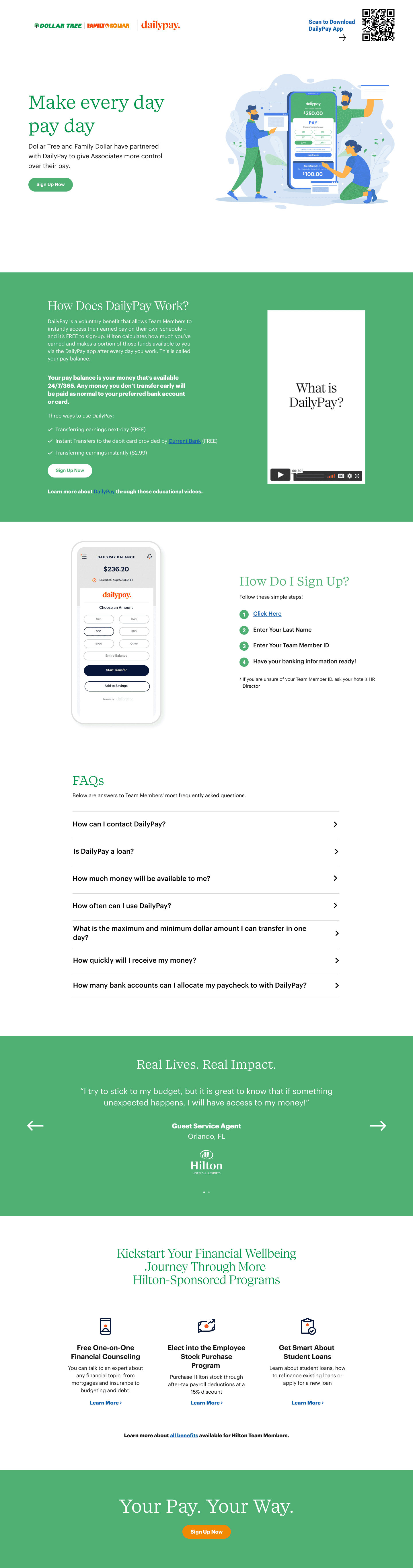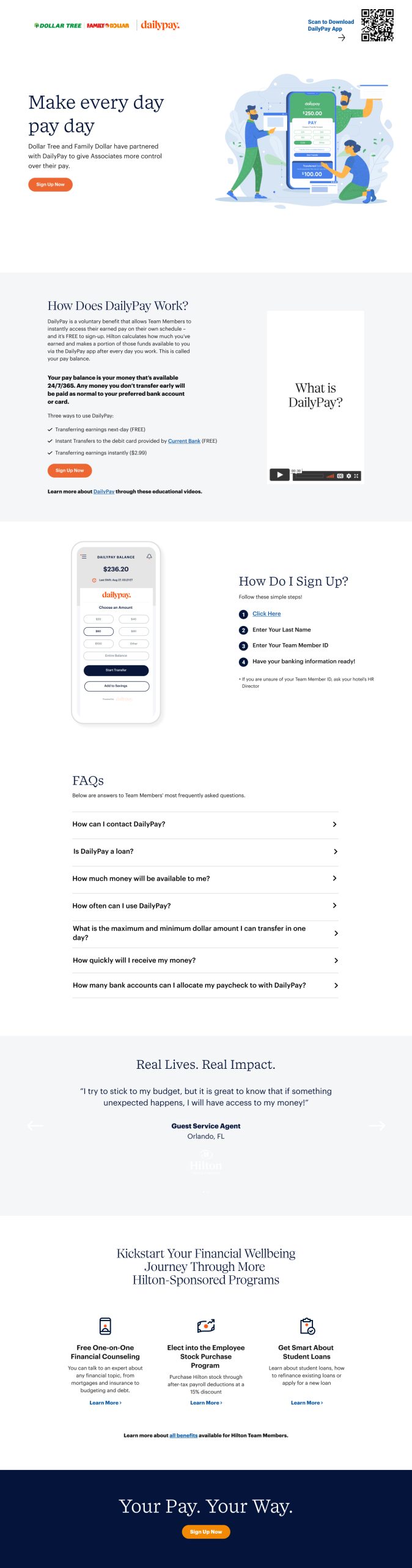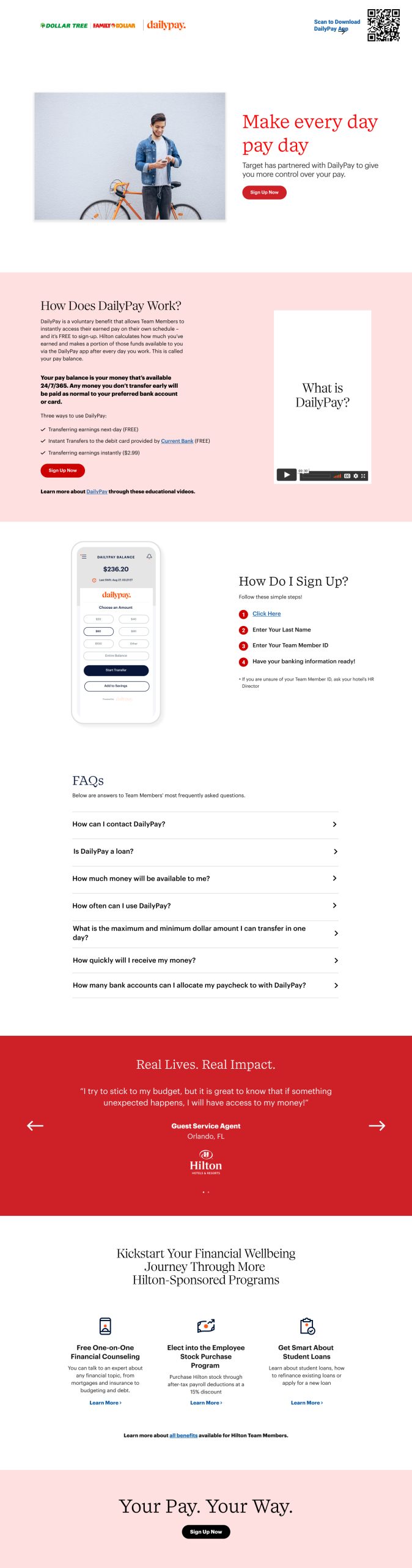 In collaboration with Daily Pay, a leading provider of on-demand pay solutions, I had the opportunity to enhance several front-end UI pages. Daily Pay offers a platform that enables employees to access their earned wages before their scheduled payday, providing financial flexibility and empowerment. My focus was on redeveloping partner landing pages for renowned brands such as Target, Kroger, Dollar Tree, and DaVita.